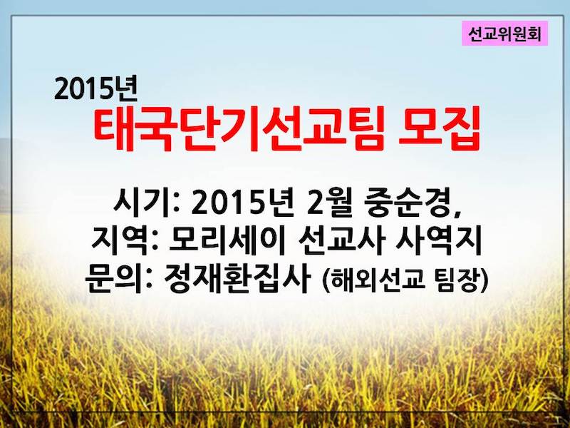 태국단기선교팀 모집 Publish on November 06,2014 | 관리자 페이지 정보 작성자 관리자 댓글 0건 조회 6,717회 작성일 14-11-06 01:37 목록 본문 태국단기선교팀 모집시기: 2015년 2월 중순경, 지역: 모리세이 선교사 사역지 문의: 정재환집사 (해외선교 팀장) 이전글역사출판위원회 도서부 안내 14.11.09 다음글소 그룹 리더 모임 14.11.06 댓글 0 댓글목록 등록된 댓글이 없습니다. 목록
