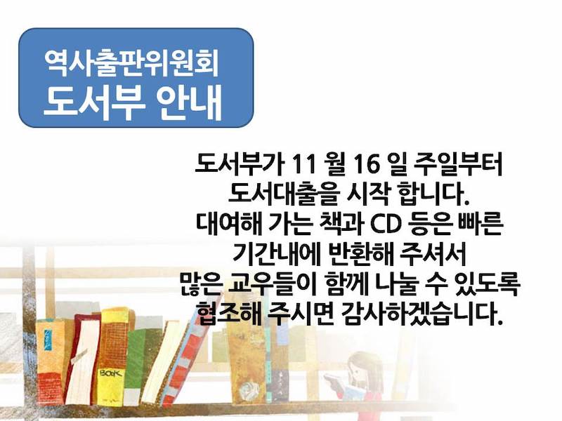 역사출판위원회 도서부 안내 Publish on November 09,2014 | 관리자 페이지 정보 작성자 관리자 댓글 0건 조회 6,445회 작성일 14-11-09 23:35 목록 본문 도서부가 11 월 16 일 주일부터 도서대출을 시작 합니다. 대여해 가는 책과 CD 등은 빠른 기간내에 반환해 주셔서 많은 교우들이 함께 나눌 수 있도록 협조해 주시면 감사하겠습니다. 이전글노인사역자 모집 14.11.09 다음글태국단기선교팀 모집 14.11.06 댓글 0 댓글목록 등록된 댓글이 없습니다. 목록