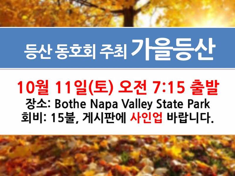 등산 동호회 주최 가을등산 Publish on October 05,2014 | 관리자 페이지 정보 작성자 관리자 댓글 0건 조회 6,512회 작성일 14-10-05 23:09 목록 본문 등산 동호회 주최 가을등산 10월 11일(토) 오전 7:15 출발 장소: Bothe Napa Valley State Park 회비: 15불, 게시판에 사인업 바랍니다. 이전글단기선교 보고 14.10.05 다음글가을 선교음악회 14.10.12 댓글 0 댓글목록 등록된 댓글이 없습니다. 목록