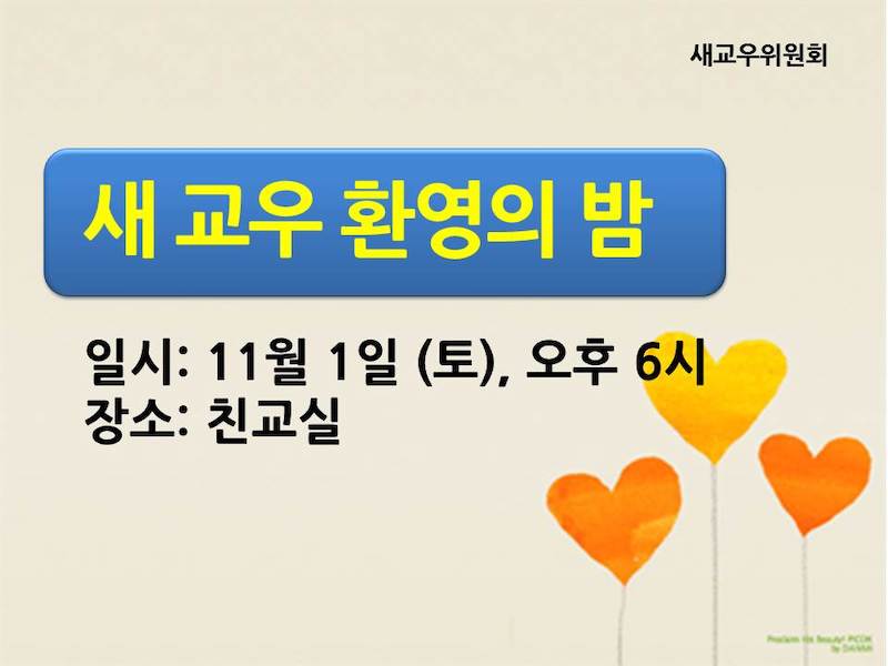 새교우환영의밤 Publish on October 21,2014 | 관리자 페이지 정보 작성자 관리자 댓글 0건 조회 6,538회 작성일 14-10-21 12:16 목록 본문 새 교우 환영의 밤 일시: 11월 1일 (토), 오후 6시 장소: 친교실 이전글2015 노숙자 봉사 안내 14.10.21 다음글2015년 교회 주소록 교정 14.10.21 댓글 0 댓글목록 등록된 댓글이 없습니다. 목록