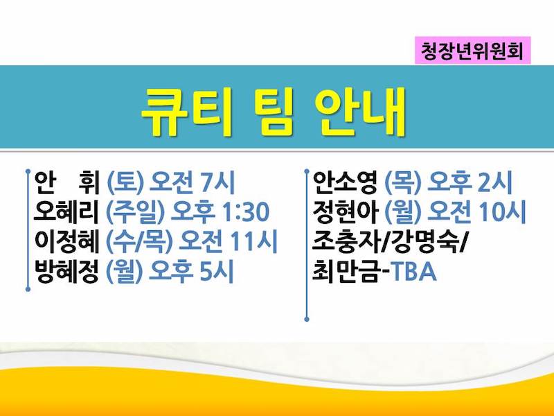 4)큐티 팀 안내: 안 휘-토 오전 7시, 오혜리-주일 오후 1:30,