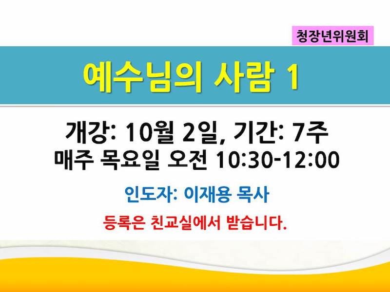 개강: 10월 2일, 기간: 7주, 인도자: 이재용 목사