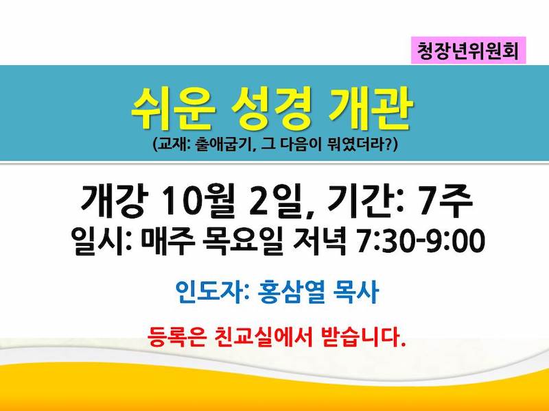 개강 10월 2일, 기간: 7주, 인도자: 홍삼열 목사