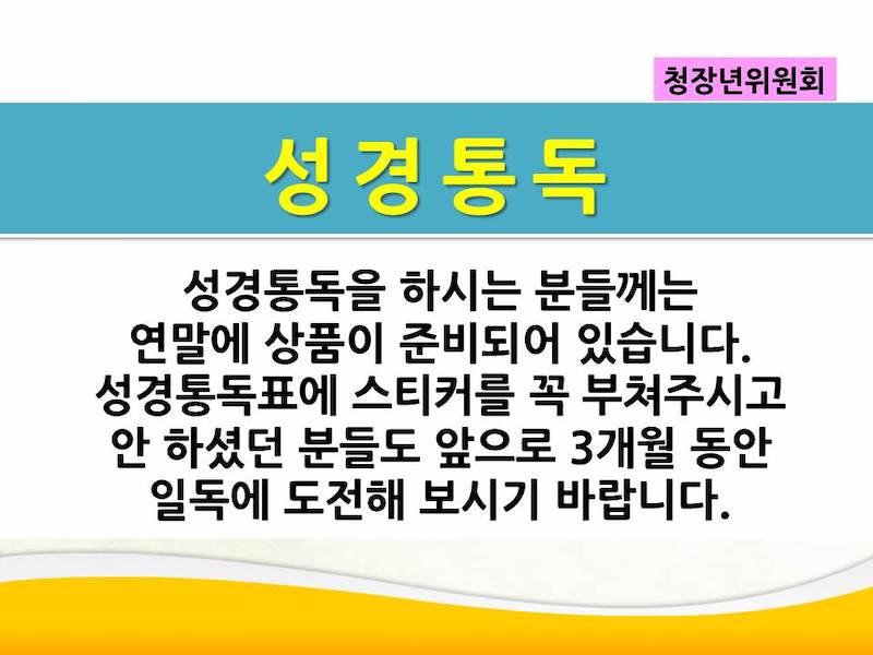3)성경통독을 하시는 분들께는 연말에 상품이 준비되어 있습니다. 성경통독표에 스티커를 꼭 붙혀주시고 안 하셨던 분들도 앞으로