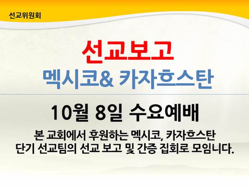 단기선교 보고 Publish on October 05,2014 | 관리자 페이지 정보 작성자 관리자 댓글 0건 조회 6,266회 작성일 14-10-05 22:38 목록 본문 선교보고- 멕시코& 카자흐스탄10월 8일 수요예배본 교회에서 후원하는 멕시코, 카자흐스탄 단기 선교팀의 선교 보고 및 간증 집회로 모임니다. 이전글AIT 청각치료방법 세미나 14.10.06 다음글등산 동호회 주최 가을등산 14.10.05 댓글 0 댓글목록 등록된 댓글이 없습니다. 목록