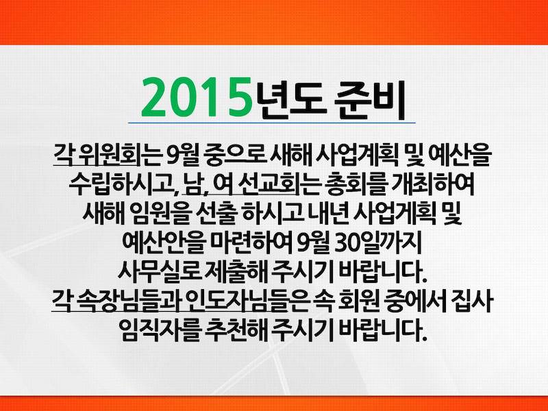 2015년도 준비 Publish on September 05,2014 | 관리자 페이지 정보 작성자 관리자 댓글 0건 조회 6,400회 작성일 14-09-05 17:57 목록 본문 2015년도 준비: 각 위원회는 9월 중으로 새해 사업계획 및 예산을 수립하시고, 남, 여 선교회는 총회를 개최하여 새해 임원을 선출 하시고 내년 사업게획 및 예산안을 마련하여 9월 30일까지 사무실로 제출해 주시기 바랍니다. 각 속장님들과 인도자님들은 속 회원 중에서 집사 임직자를 추천해 주시기 바랍니다. 이전글바울 선교회 주최 선교기금 마련 골프 대회 14.09.05 다음글2014년 8월 31일 14.08.31 댓글 0 댓글목록 등록된 댓글이 없습니다. 목록