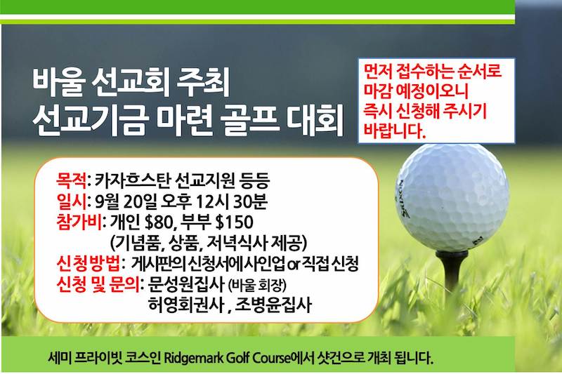 바울 선교회 주최 선교기금 마련 골프 대회(대회장 홍삼열목사님)가 세미 프라이빗 코스인 Ridgemark Golf Course에서 샷건으로 개최 됩니다. 먼저 접수하는 순서로 마감 예정이오니 즉시 신청해 주시기 바랍니다.