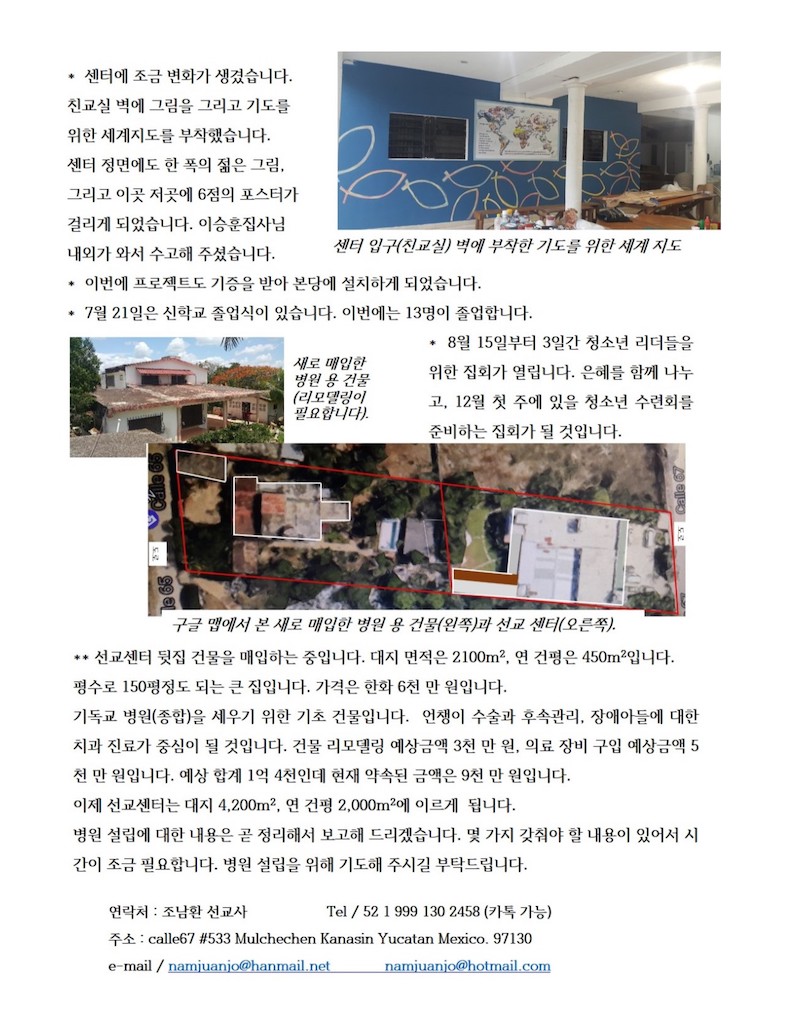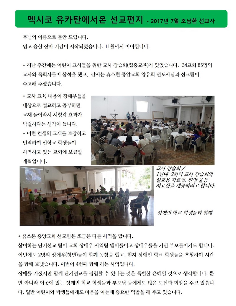 멕시코 유카탄에서온 선교편지 - 2017년 7월 조남환 선교사 Publish on July 26,2017 | 선교위원회 페이지 정보 작성자 선교위원회 댓글 0건 조회 7,473회 작성일 17-07-26 19:01 목록 본문 이전글늘찬양 선교단 소식 17.07.26 다음글몽골 선교답사 소식 17.05.30 댓글 0 댓글목록 등록된 댓글이 없습니다. 목록