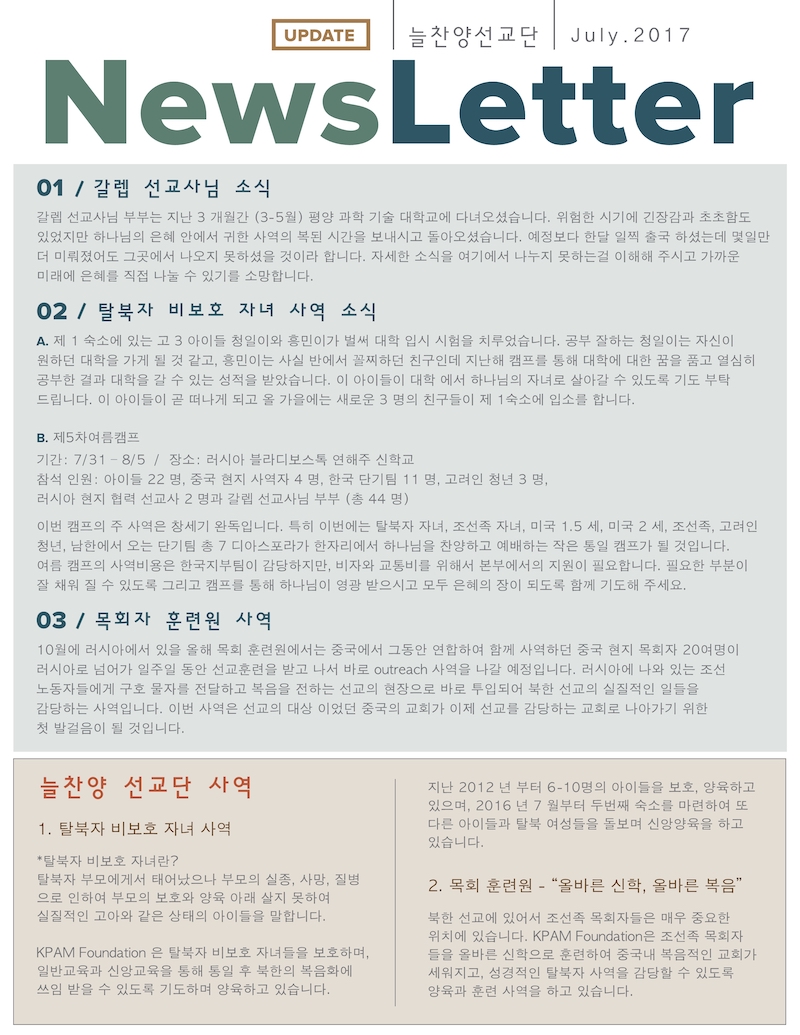 늘찬양 선교단 소식 Publish on July 26,2017 | 선교위원회 페이지 정보 작성자 선교위원회 댓글 0건 조회 7,566회 작성일 17-07-26 19:03 목록 본문 이전글몽골에서 인사드립니다 - 김선례 선교사 17.09.19 다음글멕시코 유카탄에서온 선교편지 - 2017년 7월 조남환 선교사 17.07.26 댓글 0 댓글목록 등록된 댓글이 없습니다. 목록