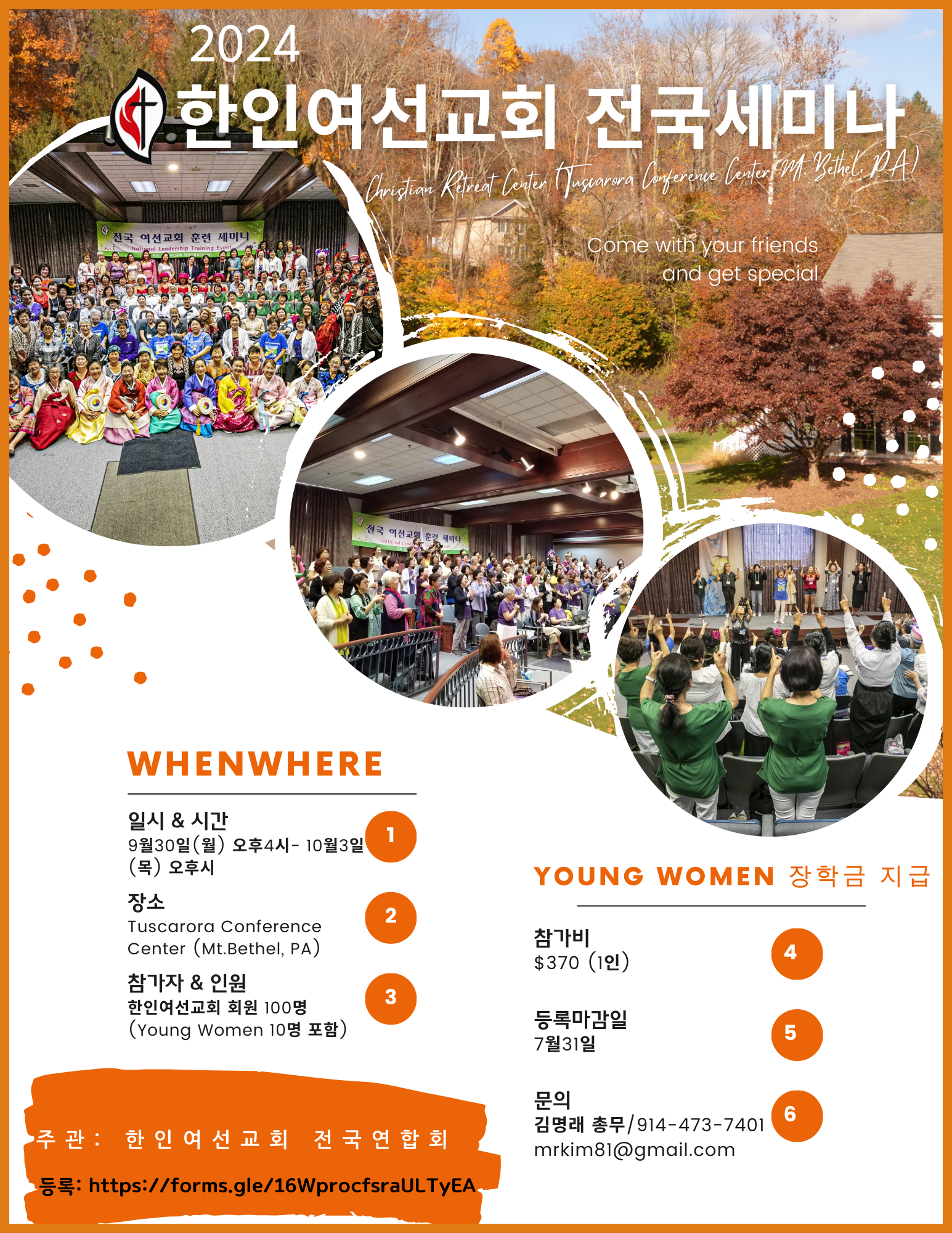 편안하고, 프로그램의 장소도 편리한 시설입니다. 그래서 아름다운 자연 속에서 ‘한인여선교회 전국세미나’를 통해서 영적으로, 신체적으로 재 충전할 수 있는 좋은 기회가 될 것입니다. 포스터에 ‘등록하기’를 누르면 ‘등록신청서’가 나오는데 그 신청서를 작성하시고, 등록비는 최정희 회계에게 Zelle 또는 Check를 우편으로 보내시면 됩니다. 아래 내용을 잘 보시고 교회의 여선교회 회원들께 홍보하시고, 등록해 주시길 부탁드립니다.