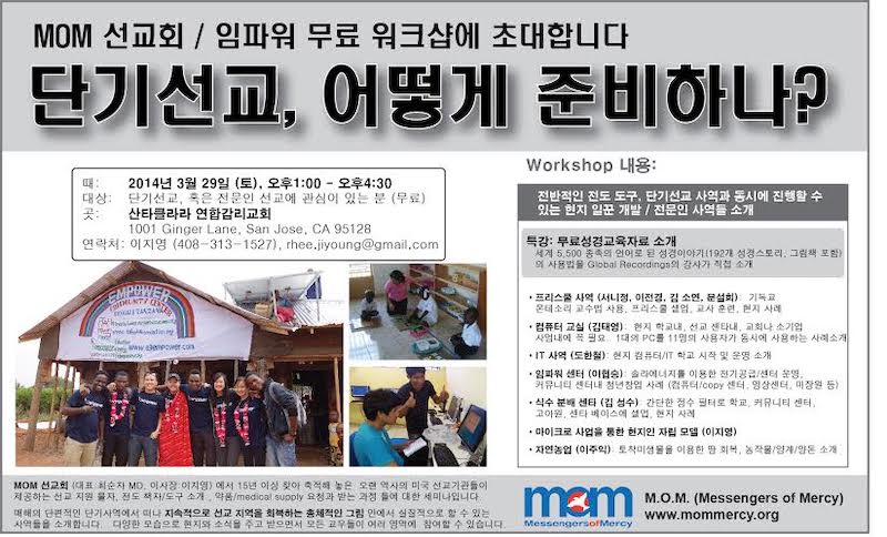 M.O.M 선교회/임파워 워크샵이 3월 29일 오후 1시부터 4시 30분까지 교회 친교실에서 있습니다.
