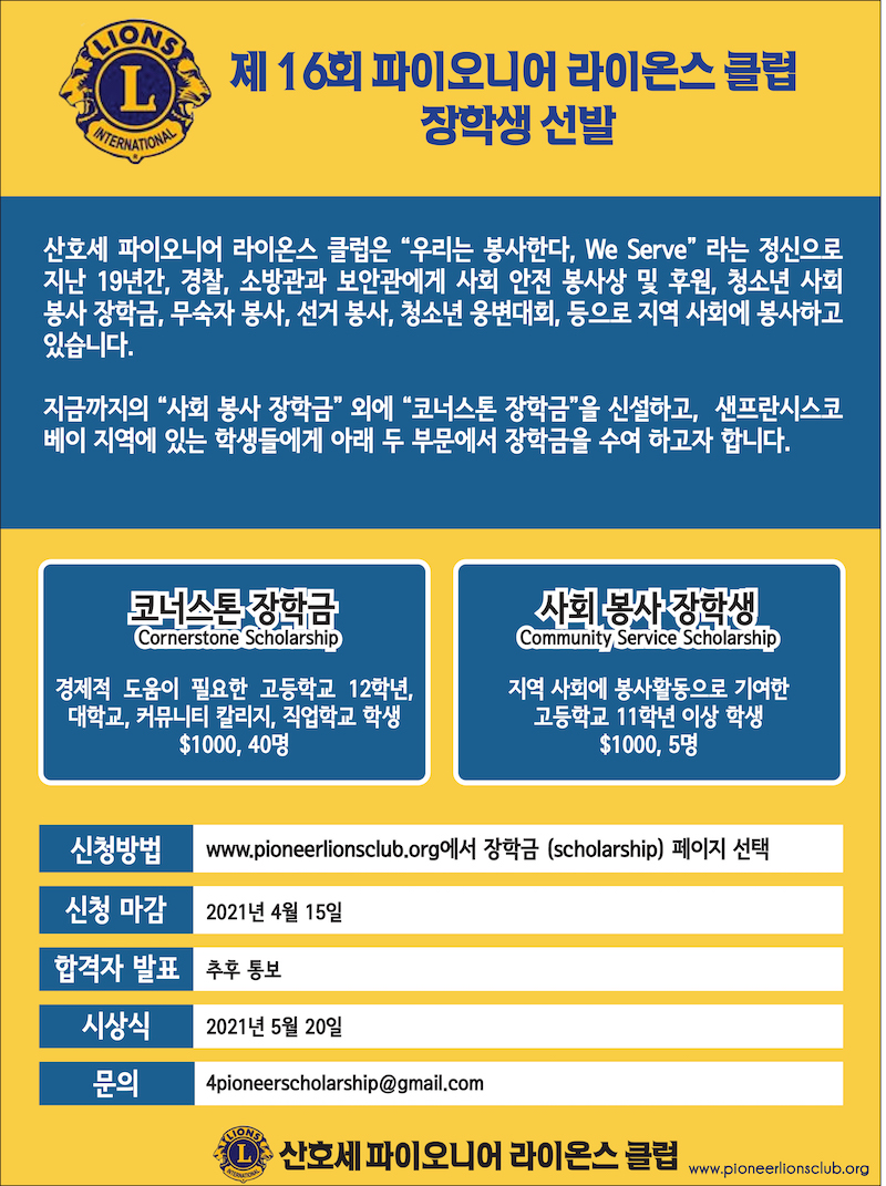 신청: www.pioneerlionsclub.org