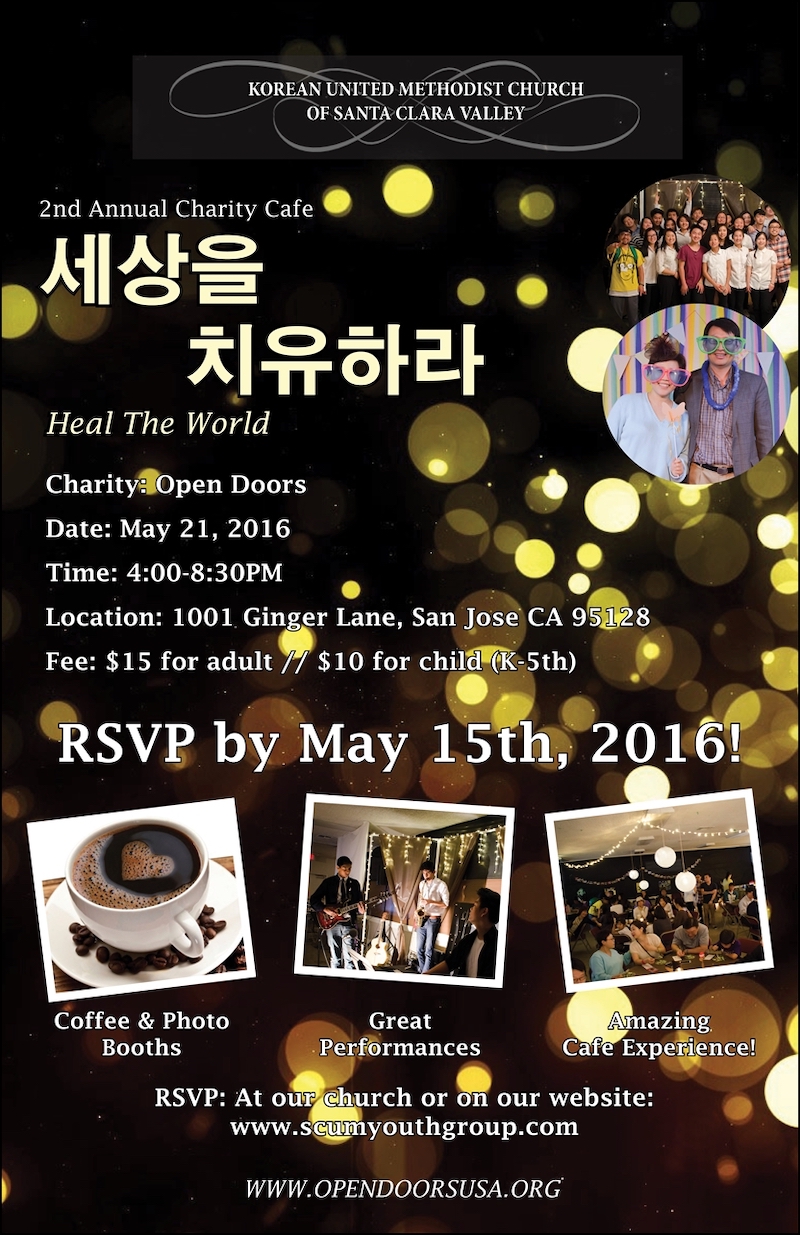 charity cafe - 자선 카페 Publish on May 09,2016 | 중.고등부 페이지 정보 작성자 중.고등부 댓글 0건 조회 4,480회 작성일 16-05-09 00:23 목록 본문 제 2회 자선카페 - "세상을 치유하라"중고등부가 주관하고 EM 과 한어청년부가 함께하는 행사입니다. 오랫동안 정성으로 준비한 행사에 많은 협조와 참여 부탁드립니다. 이전글자선 카페의 밤 스케즐 16.05.19 다음글[웹팀 공지] 웹페이지 오류 및 복구 안내 16.05.04 댓글 0 댓글목록 등록된 댓글이 없습니다. 목록