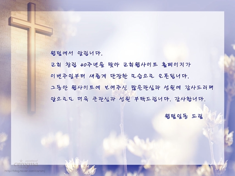 그 동안도 교회를 위해 수고 많이들 하셨는데, 앞으로도 신앙의 성장을 위해 많은 도움주실 줄 알고 웹팀에 감사드립니다.