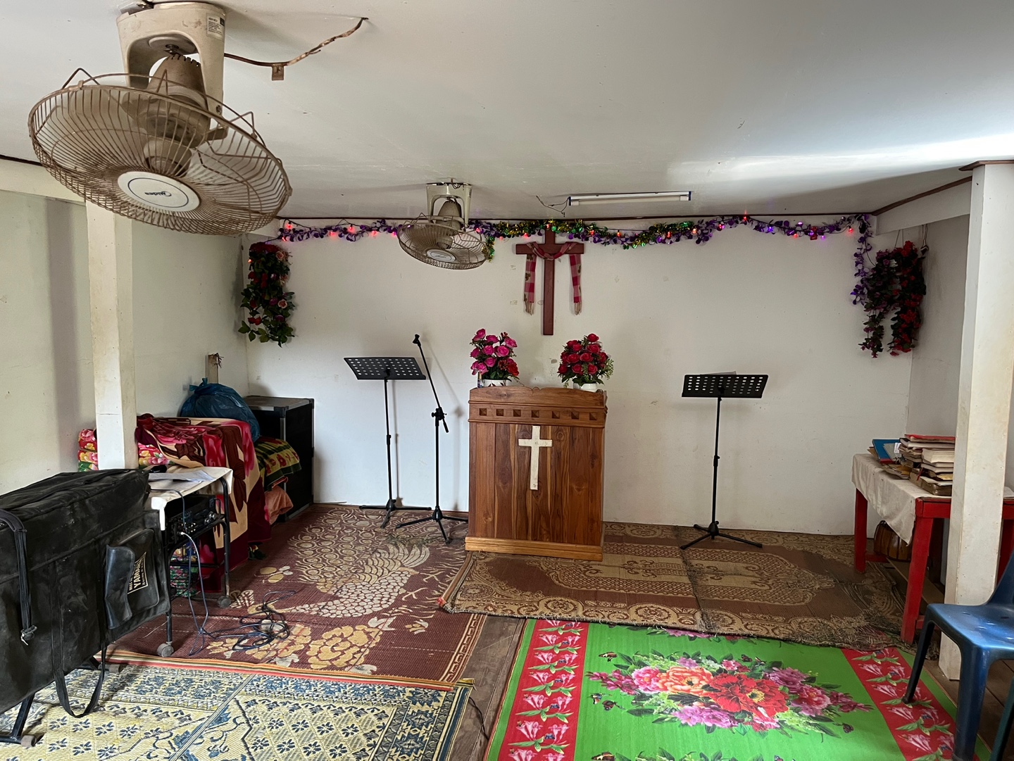 This house church was larger and well-maintained. The pastor-in-training was skilled in guitar and had construction experience, resulting in a beautifully built church. Though there were many female members, the church lacked a kitchen, and meals were prepared using traditional open-fire cooking, commonly seen in refugee camps.
