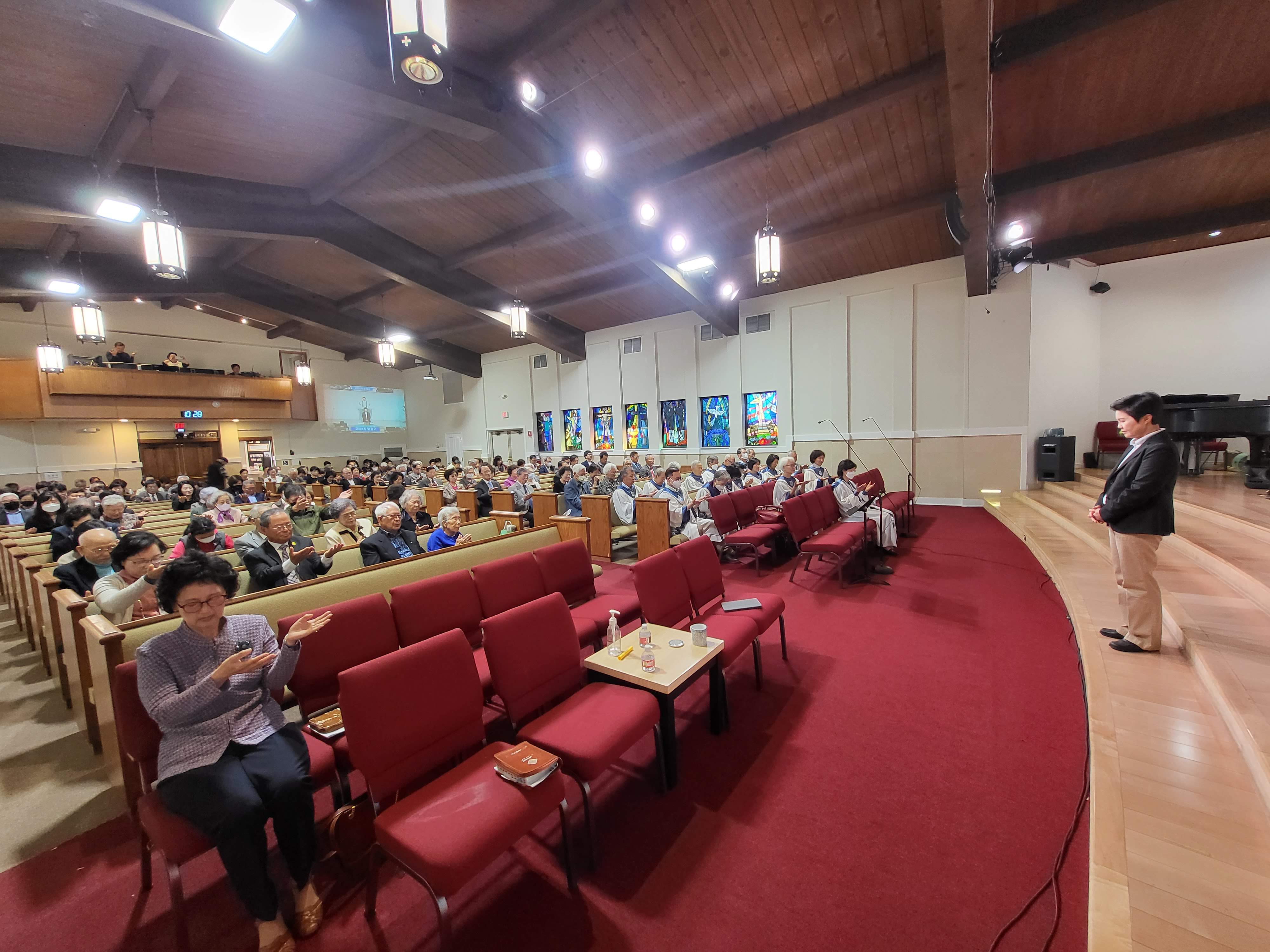 지난 주일 예배에서 온 교우가 남명신 목사님을 축복하며 기도의 손을 뻗었습니다.