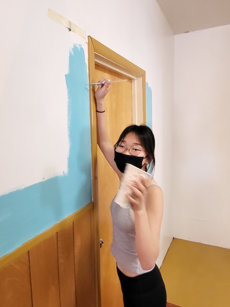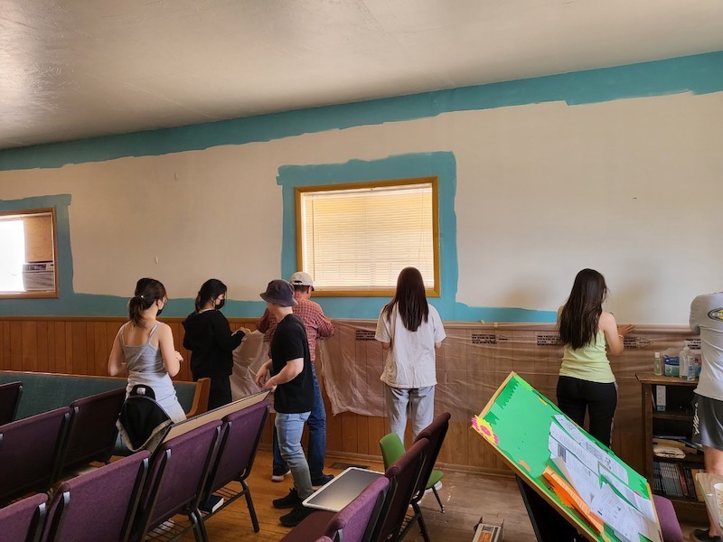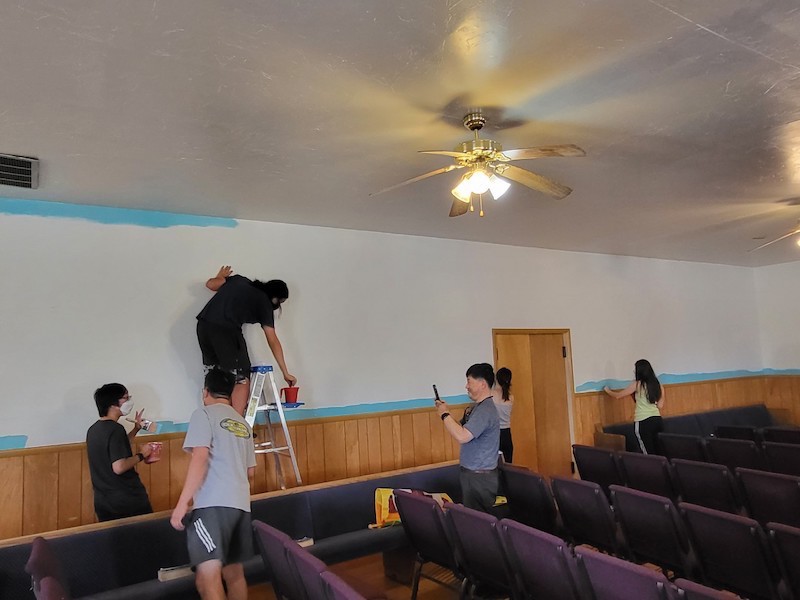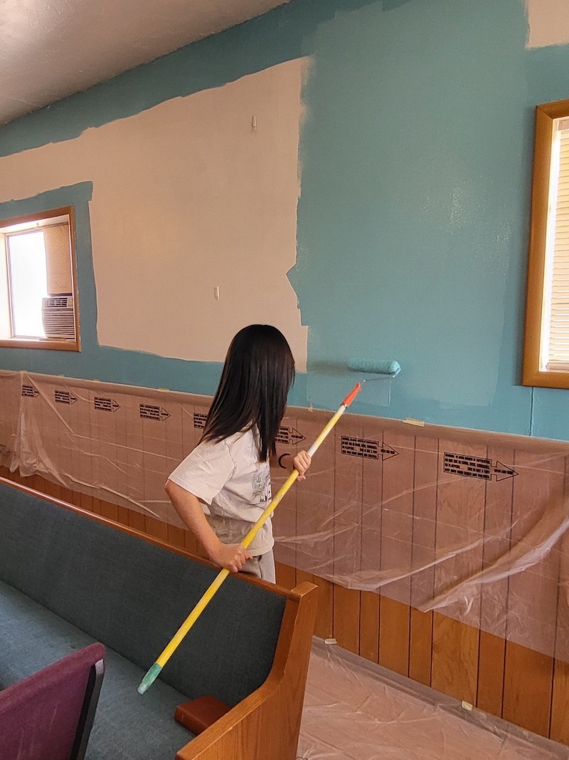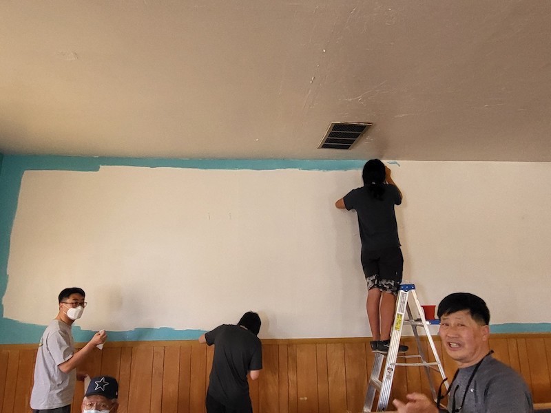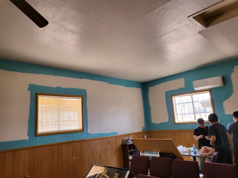 선교사님께서 미리 준비해주신 페인트 도구를 가지고 예배 당 안을 아름답게 꾸몄습니다.