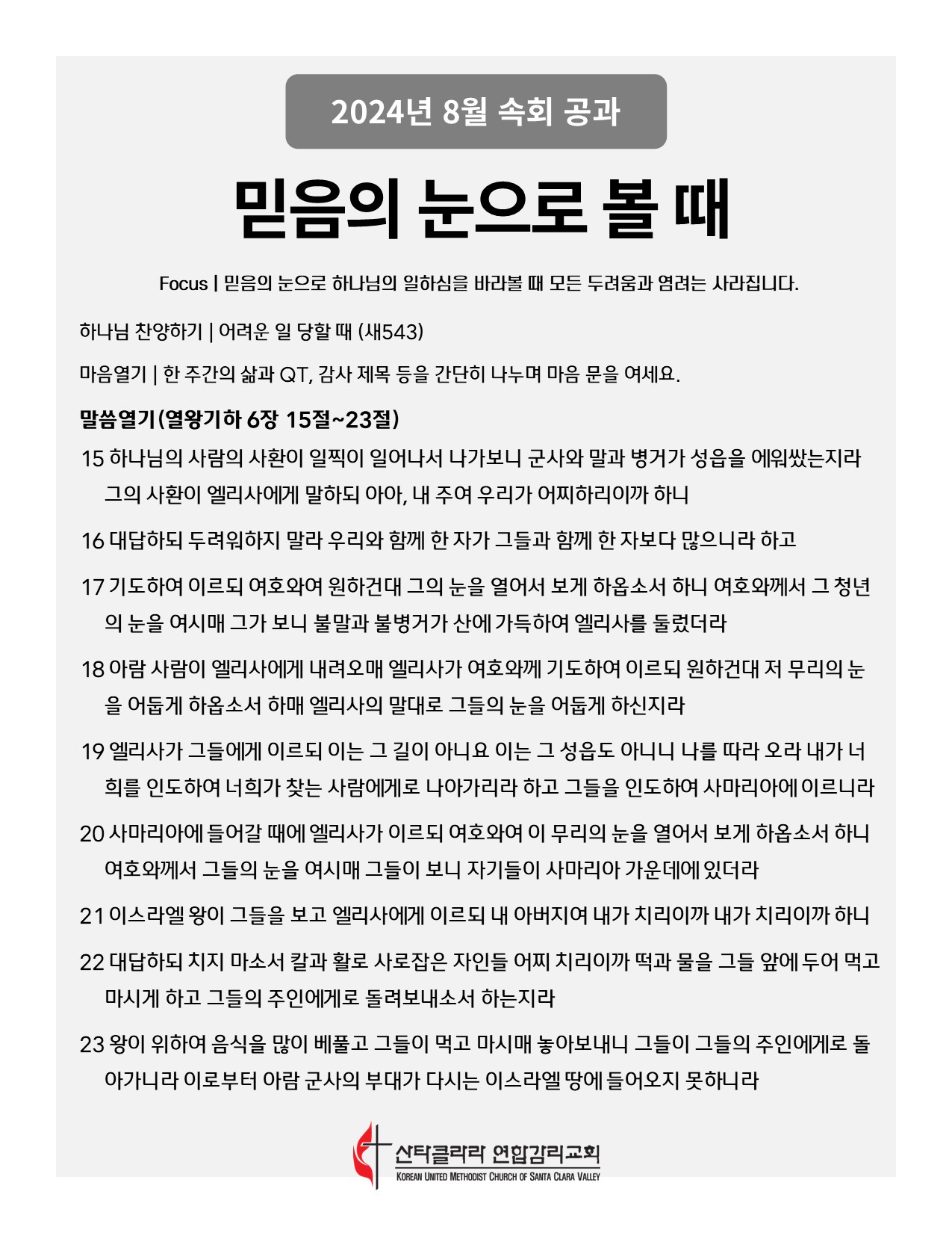 [속회공과] 2024년 8월 Publish on August 10,2024 | 박진성전도사 페이지 정보 작성자 박진성전도사 댓글 0건 조회 3,502회 작성일 24-08-10 04:58 목록 본문 [속회공과] 2024년 8월 어려운 일 당할 때(새543장): https://youtu.be/ugfWx_541m4?si=4o05d3hciMHHzkk6 모든 상황 속에서: https://youtu.be/X90cIrS3h6o?si=3bfUxUte-EanOZxs 이전글[속회공과] 2024년 9월 24.08.23 다음글[속회공과] 2024년 7월 24.06.29 댓글 0 댓글목록 등록된 댓글이 없습니다. 목록