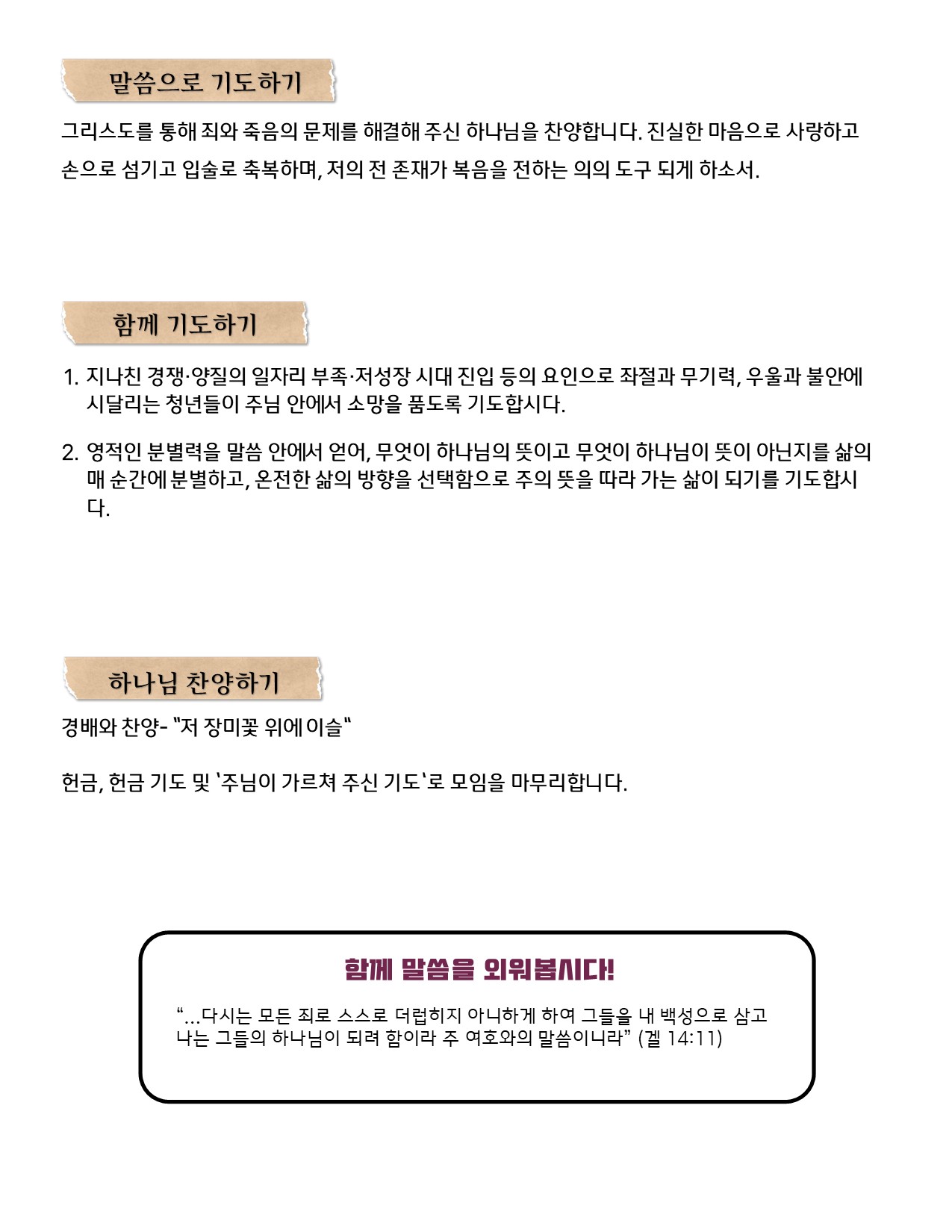 서로를 위해 중보하며 격려하는 아름다운 모임을 가지고 있습니다.